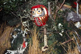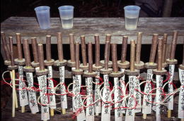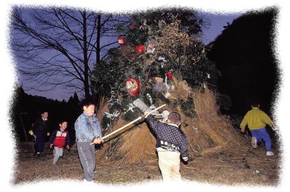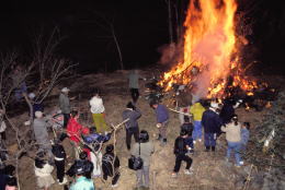 ![]() 《道陸神焼き》 小鹿野町藤倉の筒粥の神事を撮り終えた後、群馬県境の志賀坂峠 に近い橋詰地区で、道陸神焼きが行われると聞いて立ち寄った。 ドント焼きと道陸(祖)神信仰とが合体した行事との事。 子供たちは、小正月飾りの木の刀を持ってきて、焦がし、これを持ち 帰って一年間の疫病除けの護符にするという。 積み上げられた松飾り等の山に火がつけられる前のひととき。 突然、子供たちが木の刀を持ってチャンバラごっこを始めた。 その光景に、幼い頃、同じように遊んだ自分を思い出していた。 (1992年1月15日 小鹿野町河原沢・橋詰) |