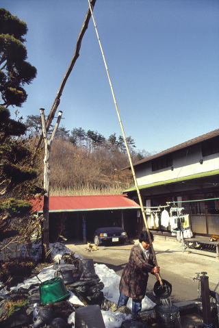《屋根より高いはねつるべ》 はねつるべのある家があると聞いて訪ねた。こちらでははねつるべのことを“はねづる”と呼ぶのだそうである。地下水の豊富なここ皆野町では、以前はあちこちで見られたとのことでもある。水道が普及したことにより、今なお現役で残っているのは宮沢さん宅くらいではないかとのこと。生活水として使うことはほとんどないが、それでも夏になると、その爽やかな地下水が恋しくて利用しているという。 井戸口のまわりには月初めに降った雪が残る中、お願いしてこのはねづるで地下水を汲んでいただいた。 −1992年2月11日撮影記より−