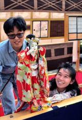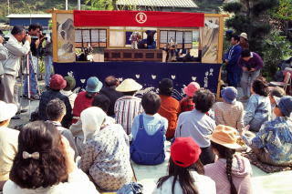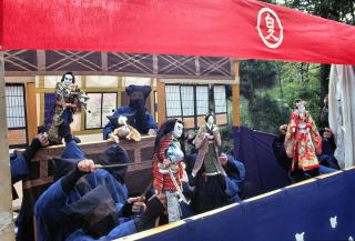 ![]() 荒川村白久の串人形 (1991.4.21) 秩父路に新緑の芽吹きが輝き出す頃、白久駅そばの豆早原区に義太夫節が響きわたる。 晴天に恵まれたこの日、公会堂前の庭先に舞台が組み立てられ、ゴザの敷きつめられた観覧席は、観音まいりやハイキング客も混じって満員であった。 二本の竹串で操る二人使いの手人形芝居が始まる。すぐそばをSLが汽笛を鳴らして通り過ぎる。春の陽射しいっぱいに、のどかな山里の素朴な雰囲気があたり一面を包む。 |