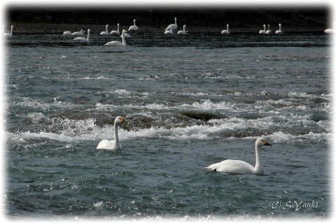 上流から流れの急な地点を下流の白鳥溜まりに向かうカップル(?)