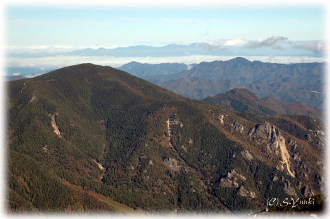 石積みのケルンのある稜線より小川山方面を見る、後方は浅間連邦