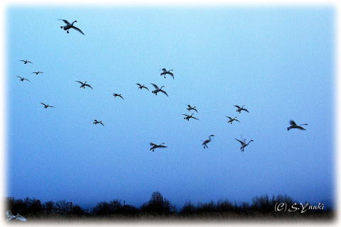 群舞(夕暮れ迫り遊水池へ戻る-舞い降りる)